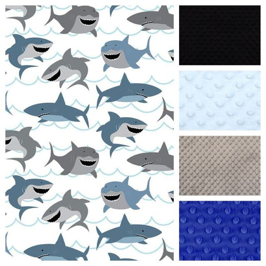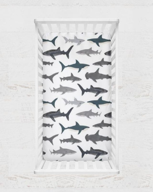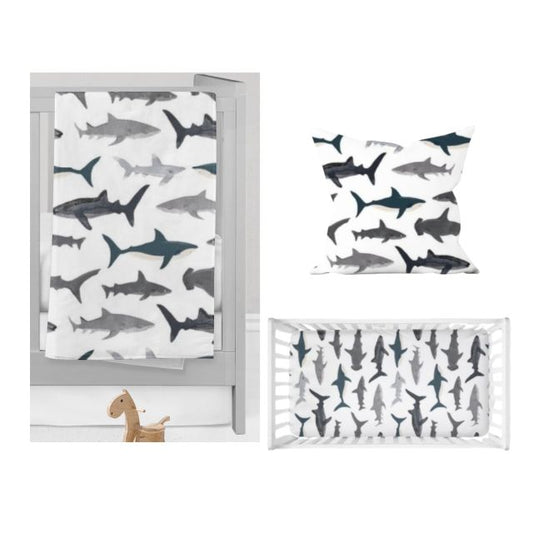 Dive into our comprehensive Shark Nursery Collection featuring these crib bedding options and nursery items. The collection includes luxurious minky blankets, soft cotton blankets, fitted crib sheets, elegant crib skirts, practical changing pad covers, decorative throw pillow covers, and coordinating nursery art prints, with many more options available. Styled in a sophisticated palette of black, navy, gray, and white, these pieces work together seamlessly to create a cohesive, ocean-inspired nursery that grows with your little one.